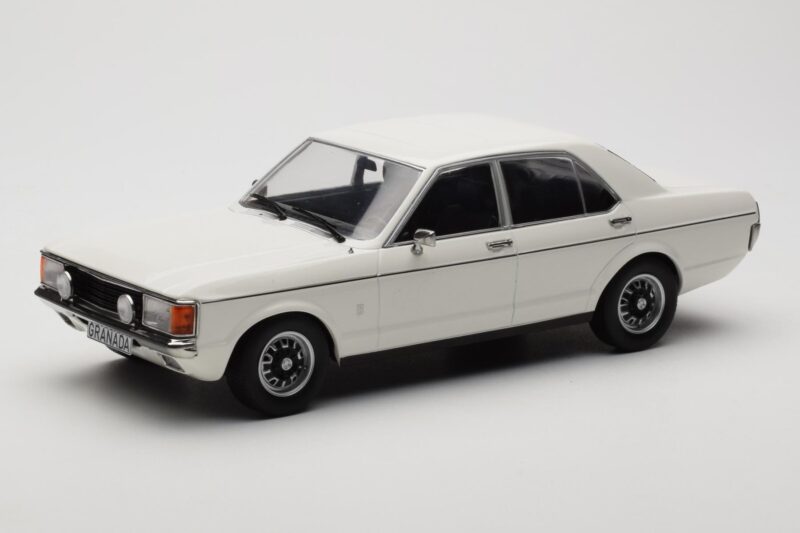 The Ford Granada Mk1 Hvid MCG 1:18 is crafted from Metal. Die-cast zinc alloy body with detailed plastic parts, rubber tires, and high-quality paint finish. Die-cast models are known for their weight, durability, and realistic feel.