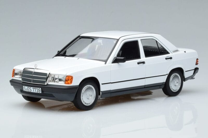 The Mercedes 190 E W201 Hvid Norev 1:18 is crafted from Metal. Die-cast zinc alloy body with detailed plastic parts, rubber tires, and high-quality paint finish. Die-cast models are known for their weight, durability, and realistic feel.