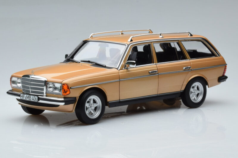 The Mercedes 200T S123 AMG Package Beige Norev 1:18 is crafted from Metal. Die-cast zinc alloy body with detailed plastic parts, rubber tires, and high-quality paint finish. Die-cast models are known for their weight, durability, and realistic feel.