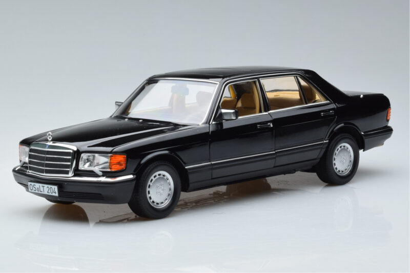 The Mercedes 560 SEL W126 Sort Norev 1:18 is crafted from Metal. Die-cast zinc alloy body with detailed plastic parts, rubber tires, and high-quality paint finish. Die-cast models are known for their weight, durability, and realistic feel.