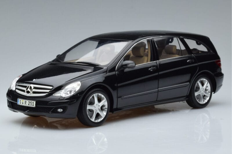 The Mercedes R-Class W251 Obsidian Sort Minichamps 1:18 is crafted from Metal. Die-cast zinc alloy body with detailed plastic parts, rubber tires, and high-quality paint finish. Die-cast models are known for their weight, durability, and realistic feel.