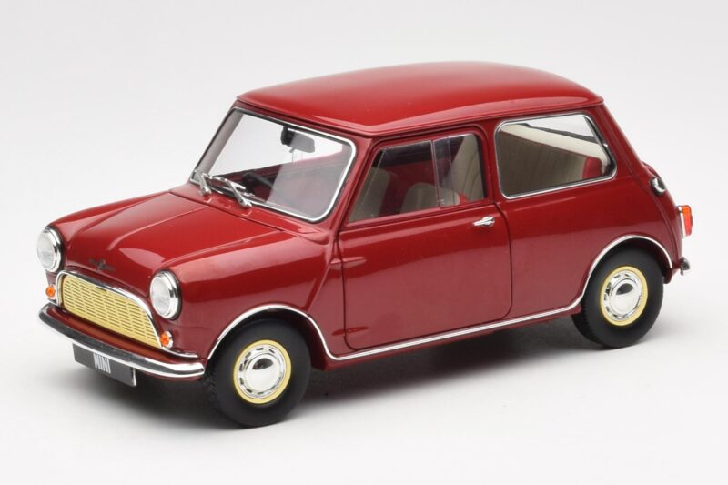 The Morris Mini Minor Rød Kyosho 1:18 is crafted from Metal. Die-cast zinc alloy body with detailed plastic parts, rubber tires, and high-quality paint finish. Die-cast models are known for their weight, durability, and realistic feel.