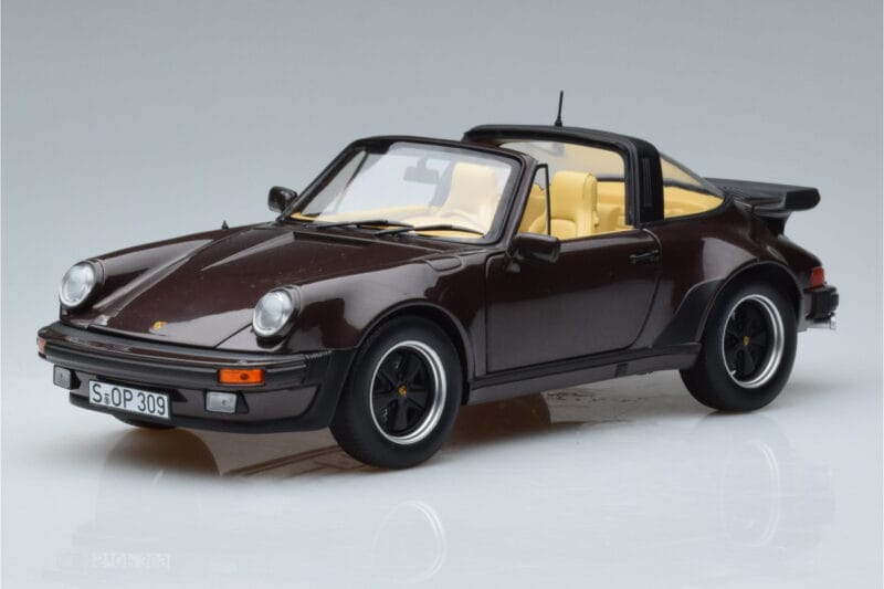 A 1:18 scale model measures approximately 25-28 cm (approximately 10-11 inches). The Porsche 911 964 Turbo Targa Brun Norev 1:18 is perfect for display in a glass cabinet or on a shelf.